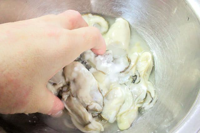 2. ボウルに牡蠣、片栗粉、水(適量・分量外)を入れて軽く混ぜて汚れを落とし、流水で洗って水気を拭き取ります。