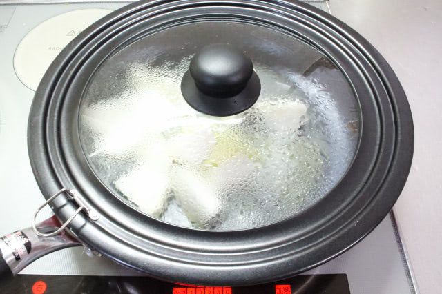 フライパンは、フタをしっかりとすれば蒸し料理にも使える調理道具。牡蠣は加熱すると硬くなって縮むので、コールドスタートでかぶがやわらかくなってから蒸し煮にするのが、おいしく作るコツのよう。