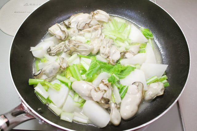 牡蠣は加熱し過ぎると硬くなるので、かぶがやわらかくなってから加えるのがポイントです。かぶの上に牡蠣と葉をのせ、3分ほど蒸し煮にしました。