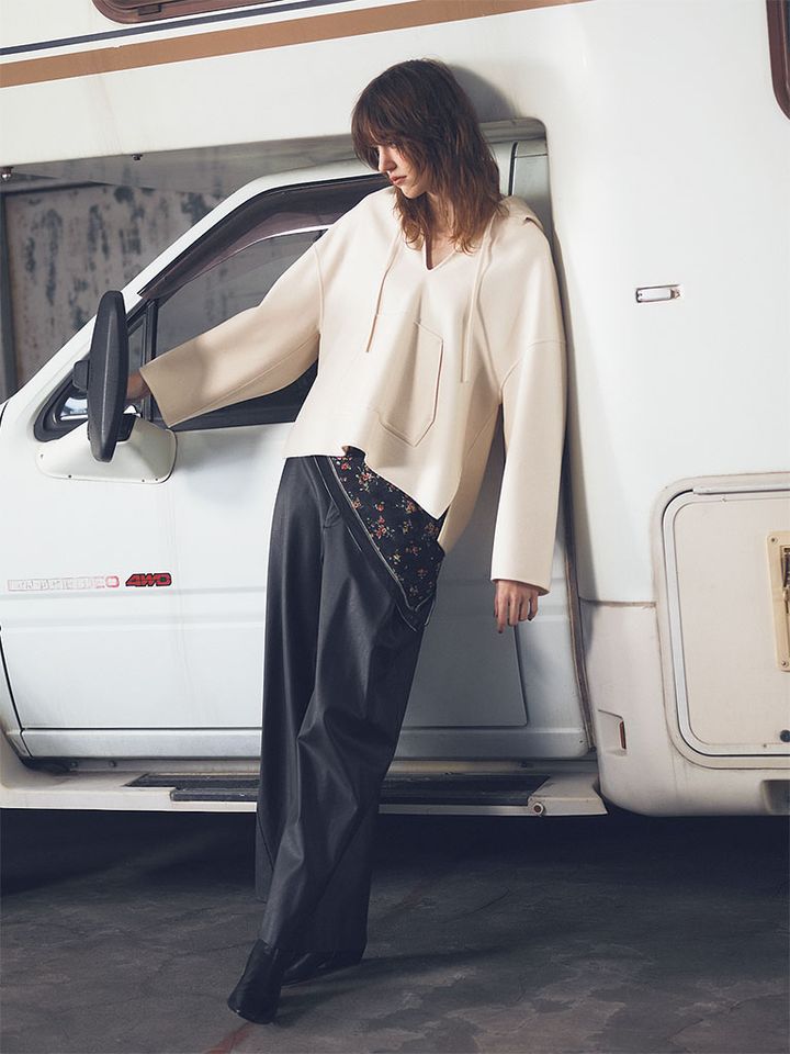 カジュアルのイメージのフーディを上質なウールメルトンで仕立てて、ミニマルに再構築。くたっとしないハリ感をもたせて、肩ひじ張らない印象は保ったままどことなくきちんと見える仕上がりに。深く開いたVネックの肌見せが、フーディを女性らしいキレが加わわるアイテムに転換。