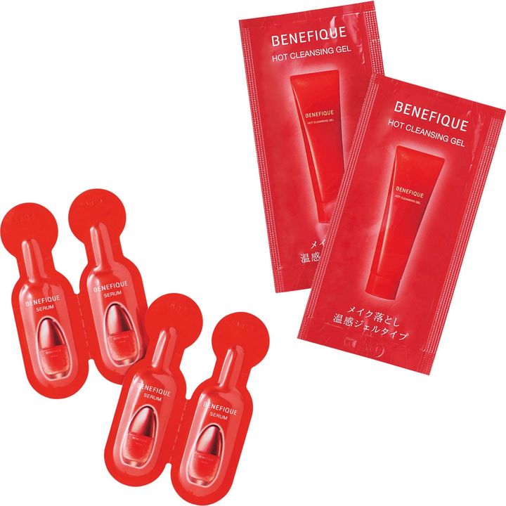 ベネフィークを代表する二大名品が付録に!左:透明ジェルと赤い粒が時間差で肌に浸透するセラム。ベネフィーク セラム 50ml ¥11,000、右:使うたびに「あったかくて気持ちい い〜」と、ホッと心までほぐされるようなホットクレンジング。ベネフィーク ホットクレンジングジェル 150g ¥3,960(ともに資生堂)