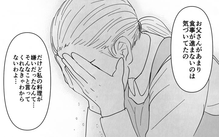 定食屋で義父と食事をした妻と娘は義実家に帰宅するが、お腹がいっぱいなこともあり、義母の料理が喉を通らない…。子どもが食べずに寝てしまったことで夫婦は口論になる。妻を責める夫を義父は止め、家族を揺るがす重大な発言をしたのだった……。