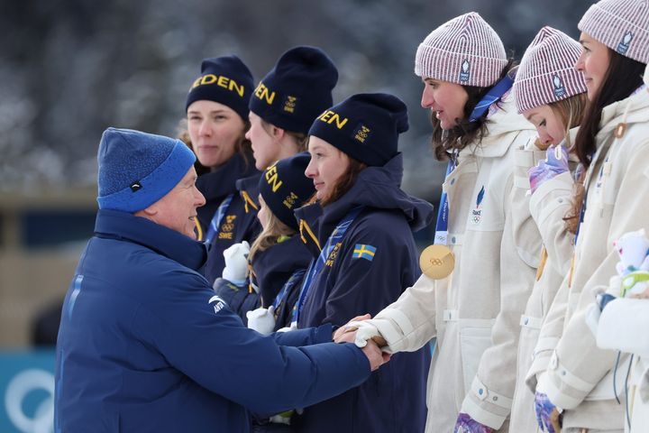 モナコのアルベール大公が、バイアスロン 女子 4×6キロメートルリレーの勝者たちにメダルを授与。フランスが金メダル、スウェーデンが銀メダル、ノルウェーが銅メダルを獲得しました。