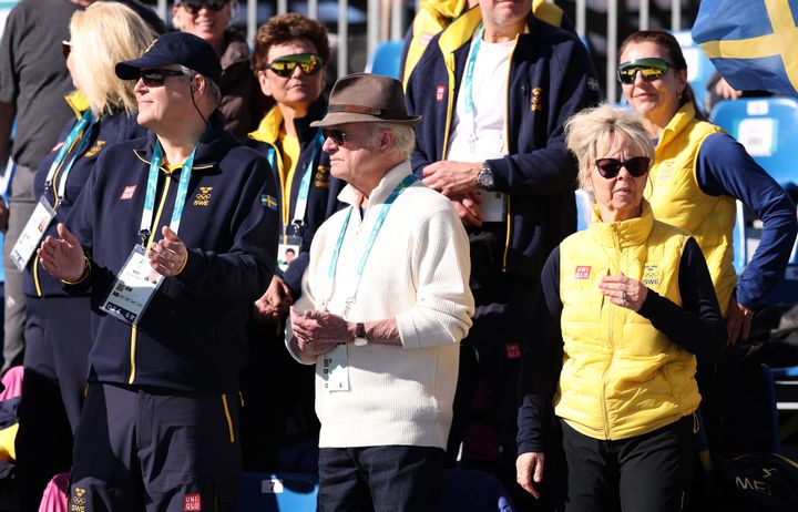 スウェーデン国王カール16世グスタフは、まぶしい白のジップニットにハットというスタイリッシュな装いで、クロスカントリースキーの男子10キロインターバルスタートフリーを応援しました。