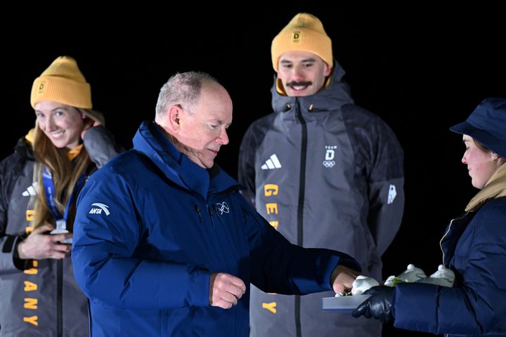 スケルトン混合団体の競技を観戦したのち、メダルプレゼンターとして表彰台の前に立って選手たちをねぎらい、メダルを授与したモナコのアルベール大公。