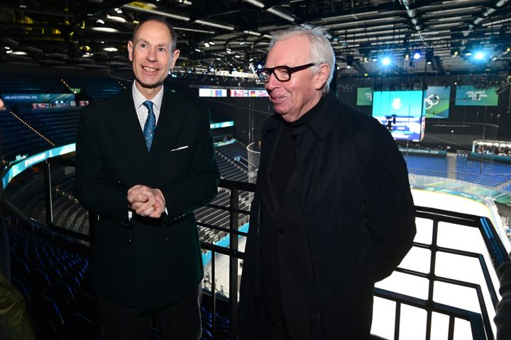 イギリスのエドワード王子(写真左)が現地入りし、アイスホッケーの試合が行われるサンタジュリア・アイスホッケーアリーナを訪問。建築を担当したイギリス人建築家、デヴィッド・チッパーフィールド(右)の案内のもと、会場を視察しました。