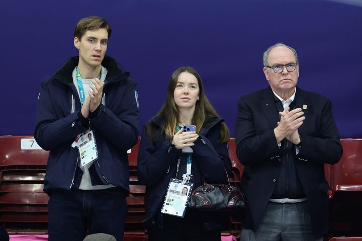 モナコのアルベール大公(写真右)は、姉カロリーヌ公女(ハノーファー王子妃)の次女であるアレクサンドラ・フォン・ハノーファー王女(中央)と、王女と長年交際しているベン・シルベスター・ストラウトマン(左)とともに、アイスダンスを観戦しました。