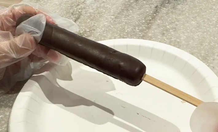 『チョコバット』を持って食べられるように、割り箸やウッドスティックを刺します。