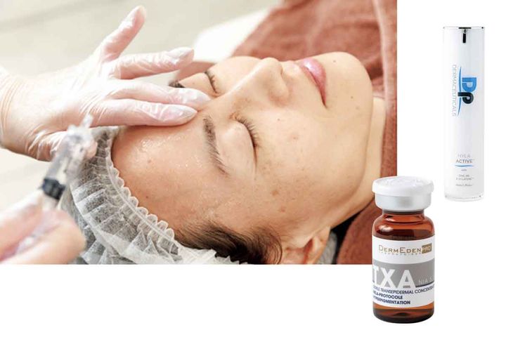 ホームケアドクターズコスメとしても人気のナイアシンアミド+トラネキサム酸(ダームエデン施術用)を塗布。