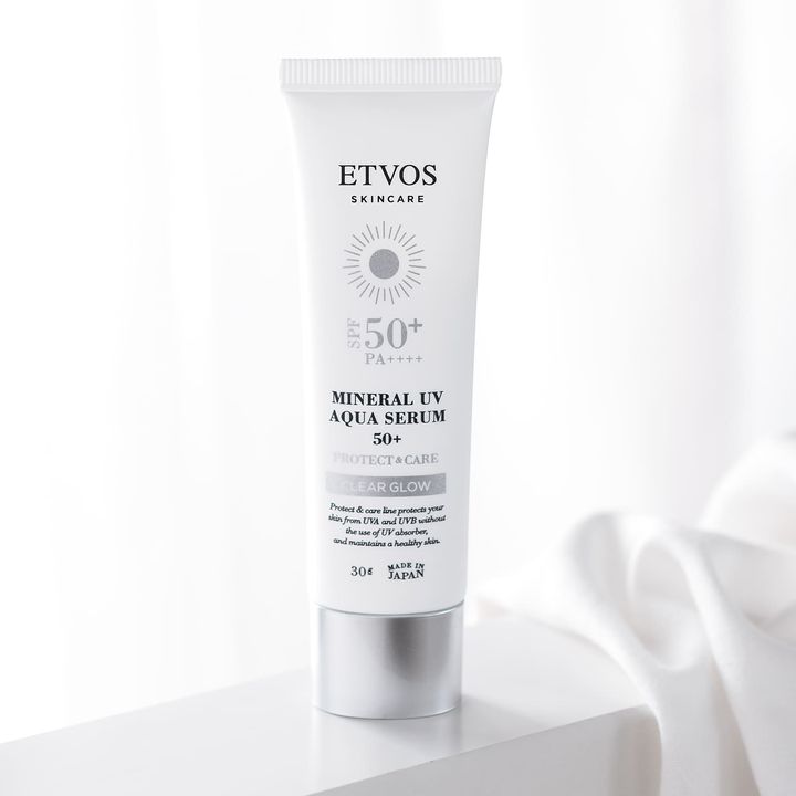 開発に約4年を費やした極上のテクスチャーは、ジェルによる水分キープ膜が肌を包み、さらりと馴染んで密着。日焼け止め特有のきしみ感やベタつきもなく、快適さが持続するうえ、Wアゼライン酸誘導体配合で、UVケアばかりか毛穴ケアまで可能に。ミネラルUV アクアセラム50+ 30g ¥3,960 ※3/4発売(エトヴォス)