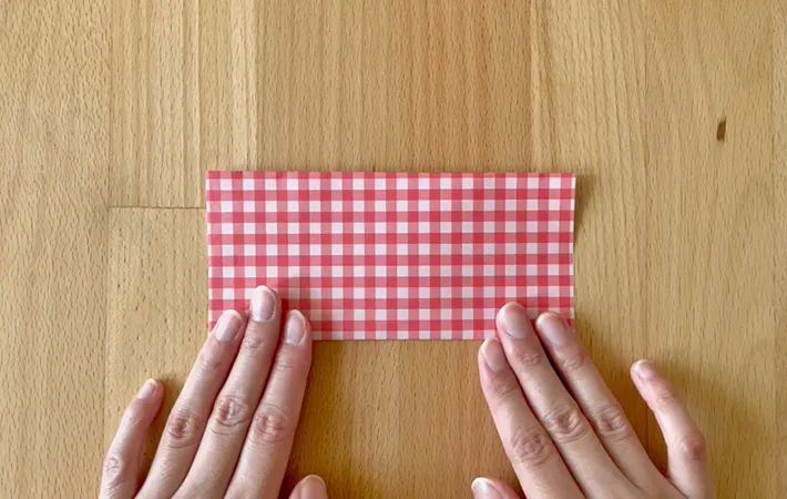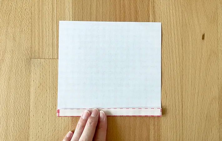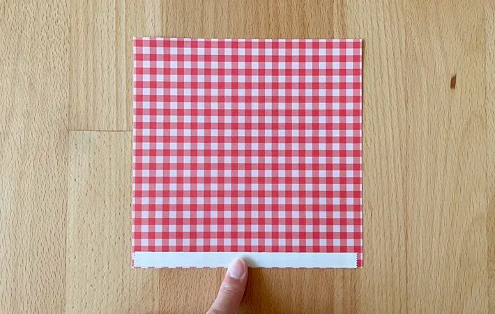 折り紙の柄があるほうの面の一辺に、両面テープを貼りましょう。