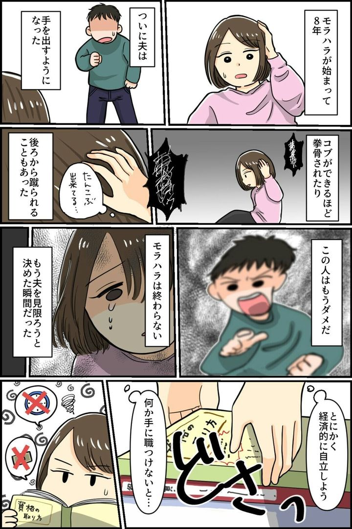 モラハラが始まってから8年…。ついに夫から暴力をふるわれるように。暴力に耐えかね、主人公は夫から「もう離れよう」と決意します。そして、自立するため、資格を取得して職を手にします。