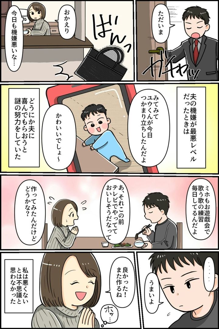 夫の顔色をうかがいながら、ビクビク生活していた主人公。機嫌をとるために必死でした。ところが、少しでも気に食わないことがあると怒鳴られ、「お前に原因がある」と、繰り返し言われ続けます。