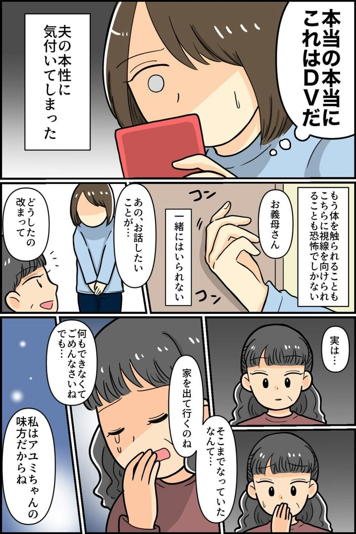 モラハラについて調べたところ、自分の夫はモラハラの「加害者」であり、そして自分は「被害者」だと気づいた主人公。そして、子どものためにも、家を出ることを決意。