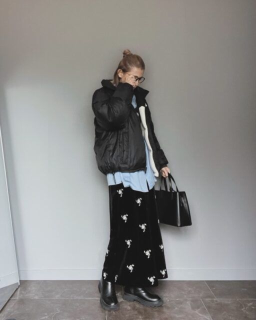 重ための冬コーデも柄モノをプラスすれば華やかに。アウター必須の時期だからスカートで取り入れるのがおすすめ。ワンランク上のガーリーコーデが楽しめますよ♪