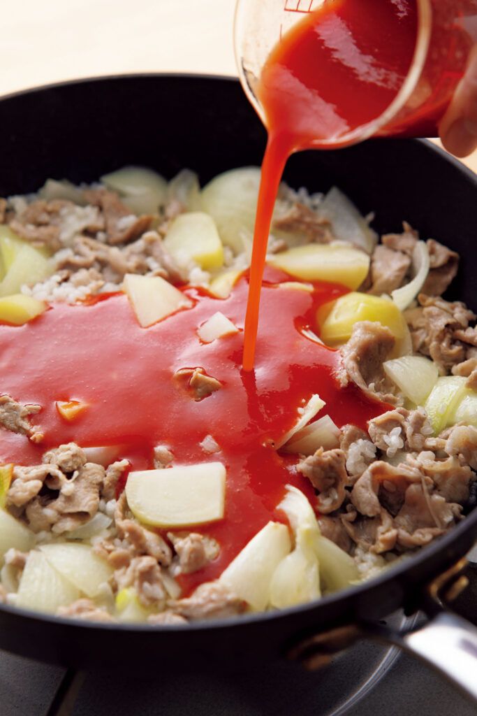 3. トマトジュースで簡単『豚こまとじゃがいものトマトリゾット』はフライパンで作れる。