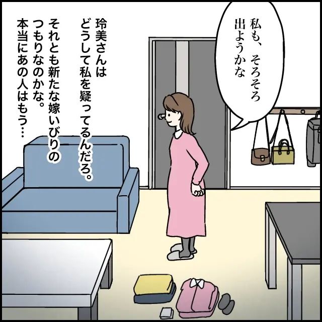 そして、「私もそろそろ出ようかな」と思いながら部屋を見回し、「玲美さんはどうして私を疑ってるんだろ。それとも新たな嫁いびりのつもりなのかな。本当にあの人はもう・・」とついつい玲美さんのことを考えてしまう私。