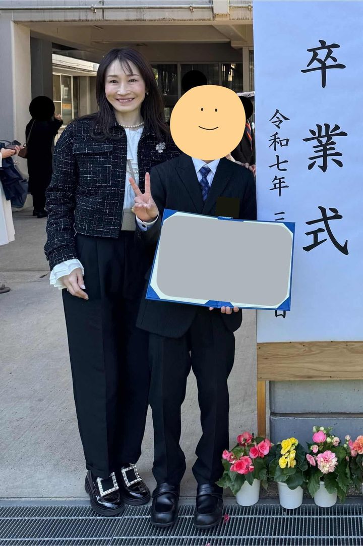 小学校の卒業式は和装で出席しました。娘の七五三や入園式の頃にちょうど息子の妊娠中で、どのような体型でも着られる素晴らしさに感動して着付けを習い始めたのがきっかけで、着付け師の免許も取りました。着物の柄や染めなど、思いや願いを込めることができるのも素敵だな〜と思い、大切な場面では着るようにしています。鮫小紋に、息子のハレの日を祝う気持ちを込めて兜と武将の帯を選びました。