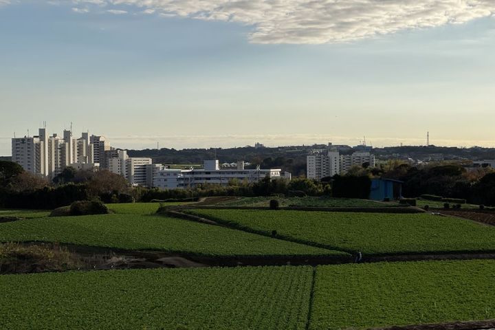 住宅街を抜けて坂道を登っていくと、一面の畑が見えてきました。ちょうど夕焼けの時間帯で、きれいな景色に目を奪われます。