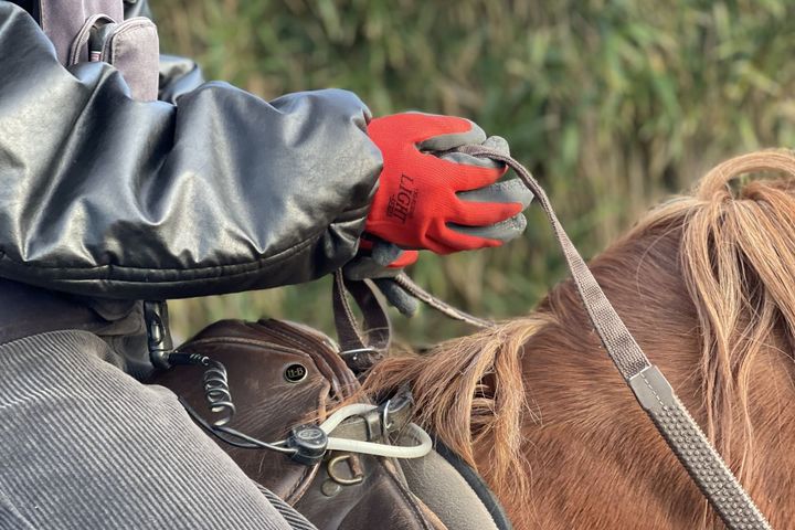 今回一緒に散策へ行くのは「ポテコちゃん」。スタッフの方にフォローしてもらいながら、ゆっくり背中に乗っていきます。馬の背中は揺れるイメージがありましたが、思いのほか安定感があり、安心して乗ることができました。