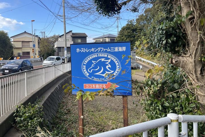 京浜急行電鉄 三浦海岸駅から徒歩約10分。駅を出てゆるやかな上り坂を進むと、「ホーストレッキングファーム三浦海岸」の青い看板があります。