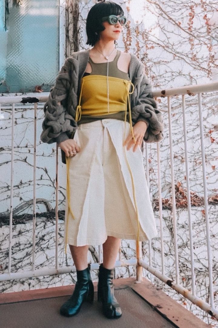 ロエベのサングラスは本人私物、パンツ¥25,300(157)、中に着たニット¥20,900(KAYLE)、styling/のカーディガン、その他は全て本人私物