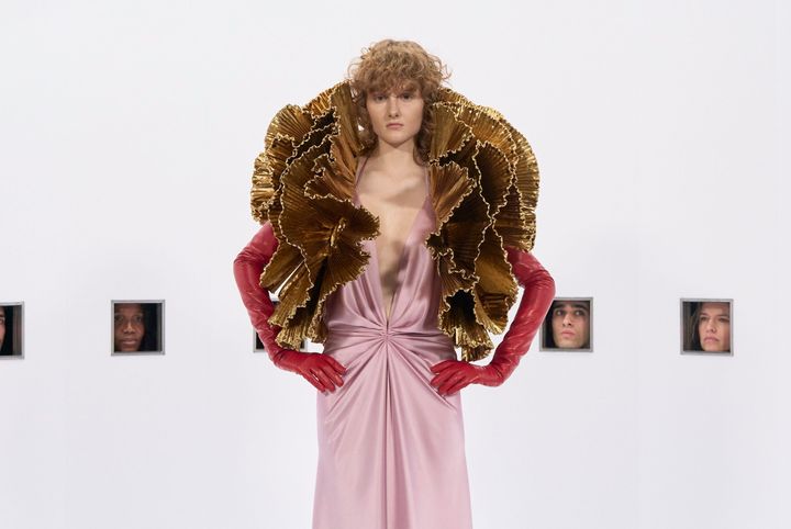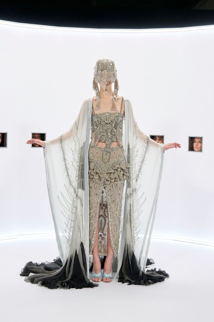 コレクションのタイトルは“Specula Mundi(世界の鏡)”。映画が現実を映し、ゆがめ、誇張してきたように、このクチュールもまた現実を映す鏡である、という宣言だろう。ファーストルックとして現れたのは、創業者が愛した赤によるドロップウエストのドレス。1930年代、まだ幼い少年だった彼が映画館で目にしたであろう、様式化されたハリウッドの女性像が、ここで鮮やかに再現された。