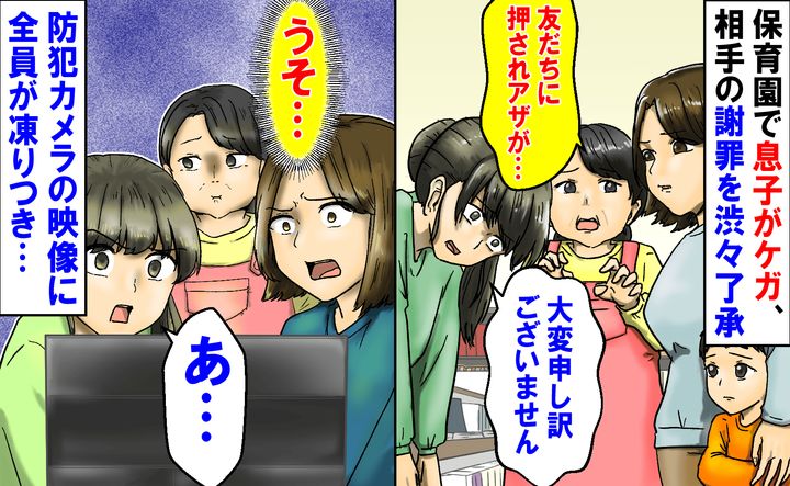 3. 園担任「友だちに押されアザが…」相手親の謝罪を渋々了承。後日、園が防犯カメラの映像を公開!全員が凍りつき…