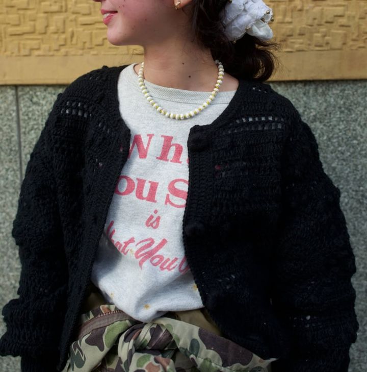 古着のロゴスウェットと柄パンツを使い、こなれたスタイリングを実現。そこに、ざっくりとした黒カーデをONして、都会的なムードを加えています。カーデはショート丈なので、ボリュームのあるスウェットやパンツとも好バランスに。シュシュやネックレスも加えて、女性らしさも演出しています。
