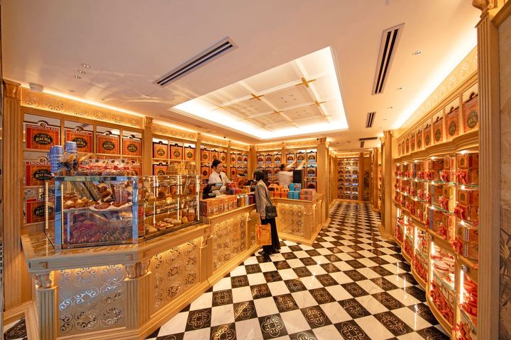 中へ足を踏み入れた瞬間、思わず「わあ……」とため息が漏れた。足元には黒と白の市松模様の大理石の床が広がり、壁一面には色鮮やかなキャニスター。入り口のすぐそばでは、目移りしてしまう各種ベーカリーが迎えてくれる。そこには、街の喧騒を一瞬で忘れさせるような、優雅で洗練された別世界が広がっている。