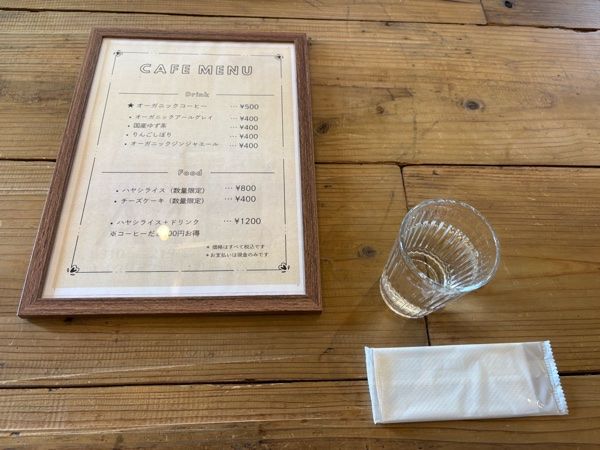 手作りの木目のメニュー。ドリンク、フード(数量限定)、好きなものをチョイス。