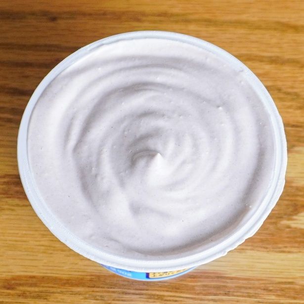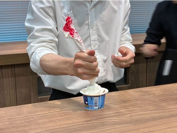 1. ヨーグルトカップにホイップクリームを入れて、なめらかになるまで混ぜ合わせる。