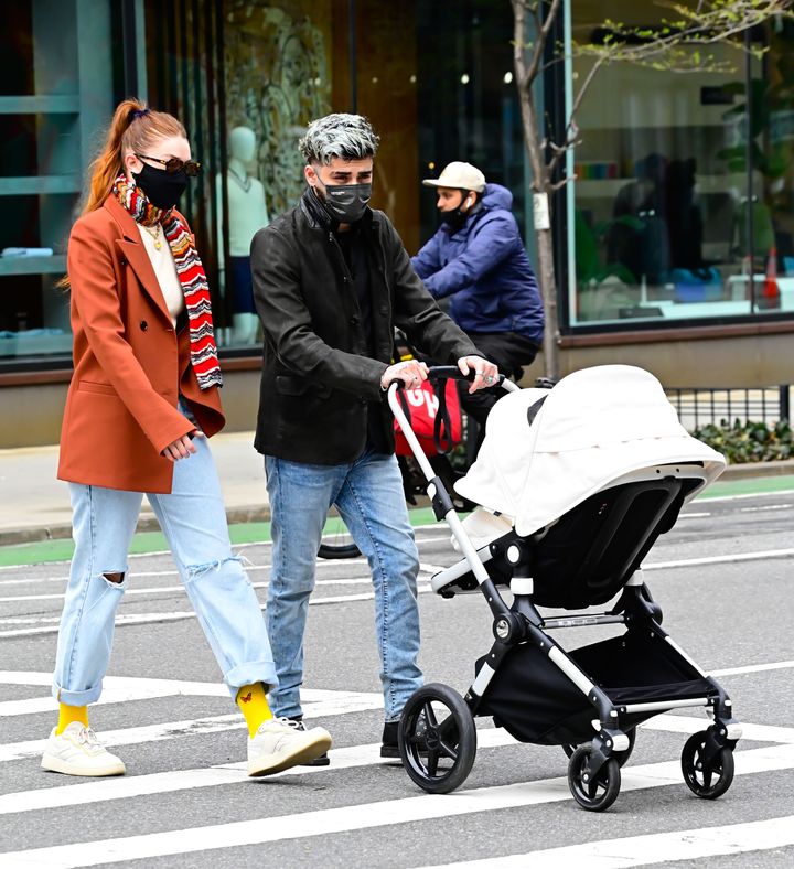 Gigi Hadid and Zayn Malik are seen walking in SoHo on March 25, 2021 in New York City.