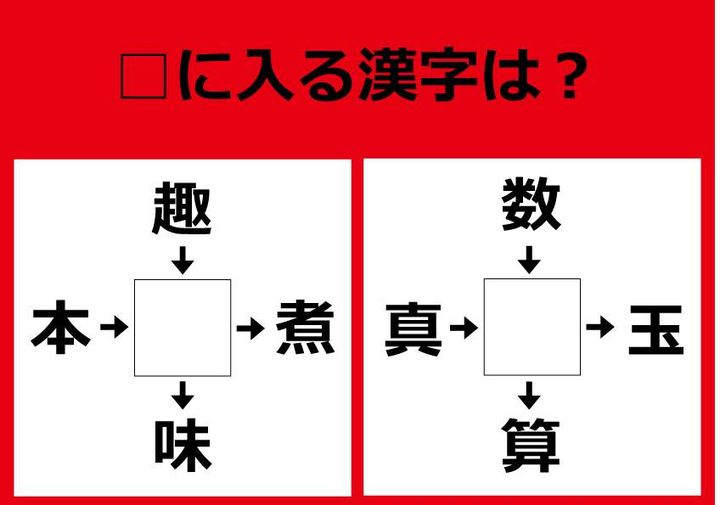 【漢字パズル】本□、趣□、□煮、□味 □に入る漢字は…?
