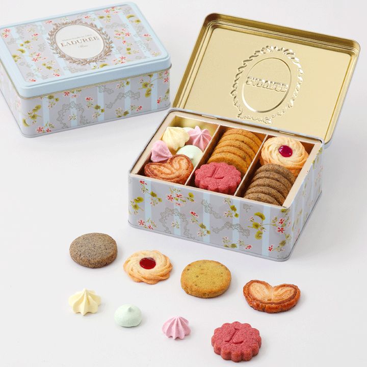 「ラデュレ」から、新作の焼き菓子アソートが登場! 淡いブルーのボックスには、可憐なピンクの小花と、エンボスで表現された立体的な王冠ロゴをあしらい、ひと目で心を奪うエレガントな佇まいだ。中には、香りや食感、彩りの異なる8種の焼き菓子を詰め合わせに。華やかな紅茶が香る「サブレ・テ・マリー・アントワネット」、アーモンドとピスタチオの深いコクが広がる「サブレ・ピスタッシュ」、バラとフランボワーズが織りなす優雅な香りの「サブレ・イスパハン」など、「ラデュレ」らしい世界観を一缶に閉じ込めている。甘美で優雅なティータイムのお供にぜひ。