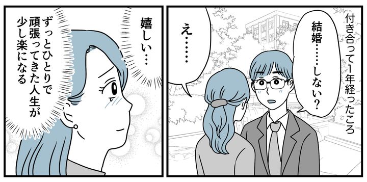 私は親子2人での暮らしに不安を感じていました。そこにタツヤさんが加わることで「ずっとひとりで頑張ってきた人生が楽になる」そう思ったのはたしかです。あまりに核心を突いたお義母さんの言葉に、何も言えなくなりました。