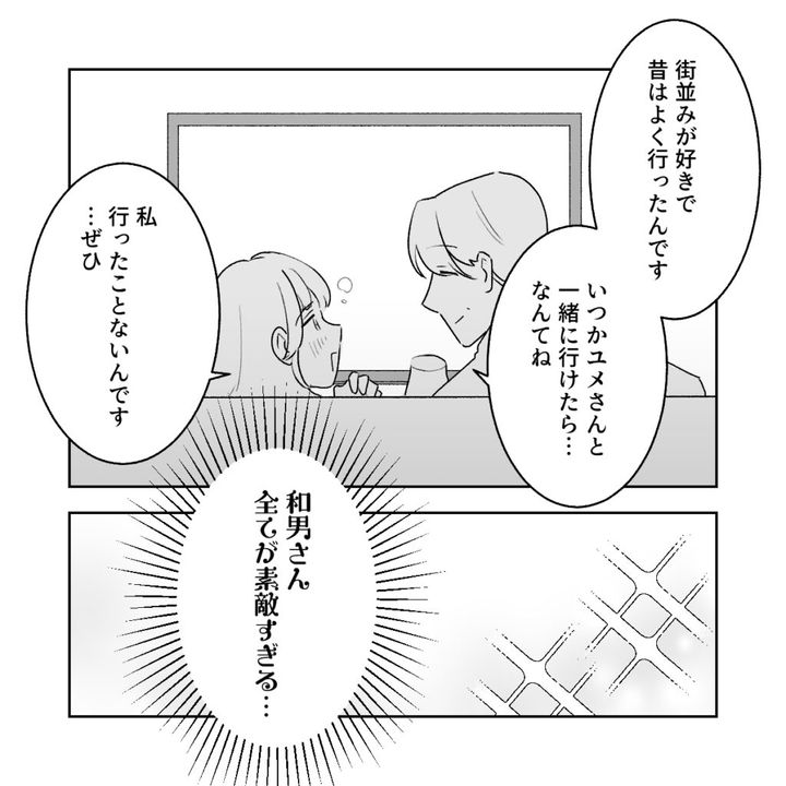 「街並みが好きで昔はよく行ったんです。いつかユメさんと一緒に行けたら・・なんてね」そう言われて、「私、行ったことないんです・・ぜひ」と和男さんを見つめながら答えつつ、「和男さん、全てが素敵すぎる・・」と気分はすっかり夢の中でした。
