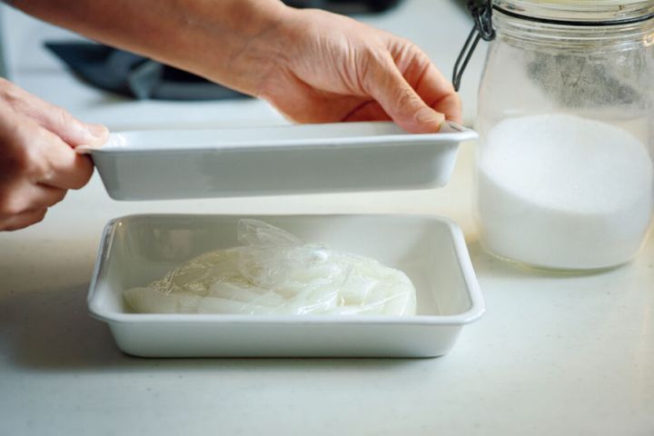 袋の中の空気を抜いて口を閉じ、バットの上に置く。もう一枚バットを重ねて重しをのせ、室温で半日漬ける。