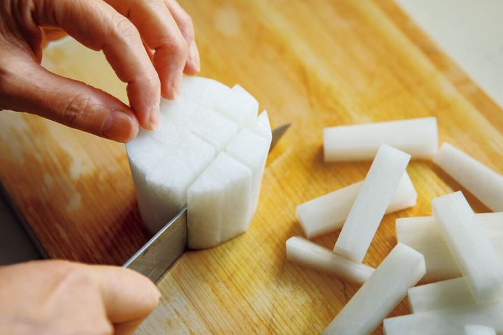 (1)大根は皮を厚くむき、長さ5cm、1.5cm角くらいの棒状に切る。