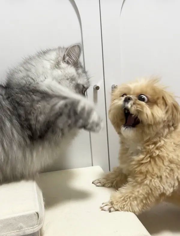 なお飼い主さんによると、この直後にキアヌちゃんは『猫パンチ』が当たっていないにもかかわらず、「猫に殴られました!」と訴えるような表情でアピールをしてきたのだそうです。