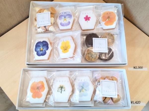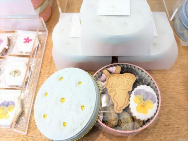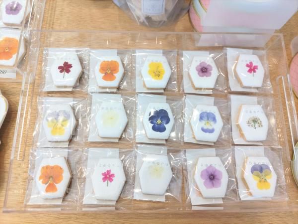 小さなお店ですが、ナチュラル色の木目の棚に、商品がセンスよくディスプレイされています。看板商品は、お花が載ったクッキー。このお花は「エディブルフラワー」、食べられるお花なんです。このお花を扱うのは、とても繊細な作業だとおっしゃっていました。色が鮮やかですよね。オーナーがお花が好きなことがきっかけで、この商品を作ることにしたんだそうです。華やかでプレゼントにぴったりです。