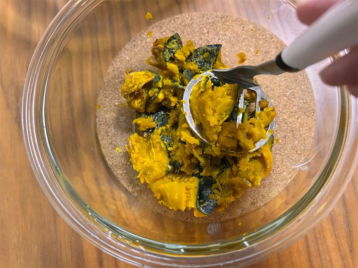 1. かぼちゃは2cm角に切り、耐熱容器に入れてラップをし、600Wの電子レンジで7~8分加熱する。粗く潰して粗熱をとる。