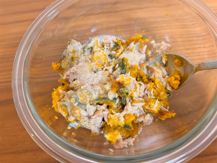ほっくり甘いかぼちゃと、ツナや卵の濃厚な味わいが絶妙にマッチ。コクと酸味のあるドレッシングがしっかり絡んで、とっても贅沢なお味です。隠し味に加えたヨーグルトが決め手となっているからか、マヨネーズだけで和えるよりも味に深みが出ていて、これはハマりそう!