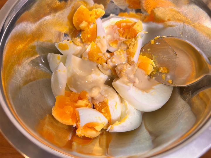 2. 鍋に湯を沸かし、ゆで卵を作る。出来たゆで卵は大きめに割り、[A]の分量から大さじ1/2程度加えて和える。