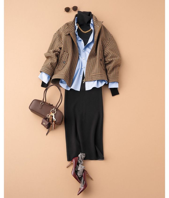 チェック柄JK × ニットスカートで女っぽくお仕事スタート。Iラインシルエット×黒なら、瞬時にハンサムが叶います。