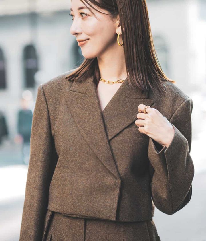 「このセットアップのクロップド丈のジャケットは、纏うだけでモードな印象を演出し脚長効果も発揮。肩の程よい幅感もポイントです。パンツは裾のベルトでシルエットが変えられるのも魅力。167cmの私には絞った方がバランスが取りやすい」(赤枝紗貴さん 45歳・パーソナルスタイリスト)
