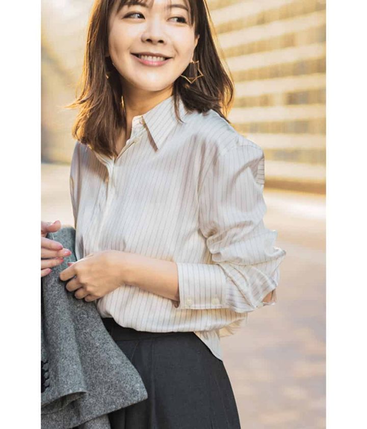 「シンプルさの中の大人に相応しい上品さに惹かれて購入したELBORNのシャツ。さり気ないストライプ柄と、とろみ素材が印象的」(杉山迪子さん 44歳・医師)