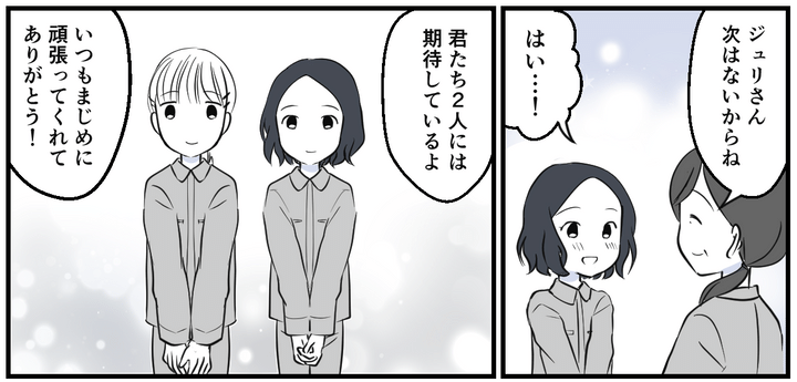 ジュリさんは、自分の都合でアンズさんに嫌味を言ってしまったことを深く反省し、頭を下げて謝罪しました。
