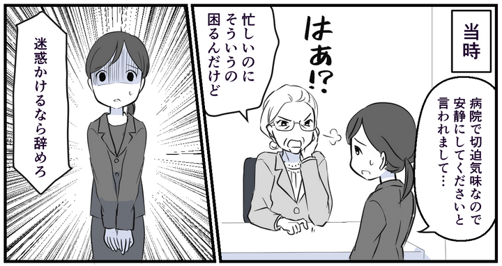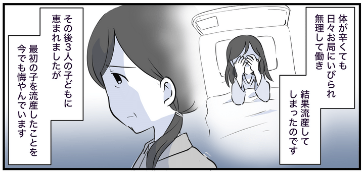 当時、切迫気味なので安静にと言われましたが、勤めていた会社が今で言うブラック企業で、休める雰囲気はなく、上司には「迷惑をかけるなら辞めろ」と日々いびられ、私は無理して出勤し、その結果、流産してしまったのです。