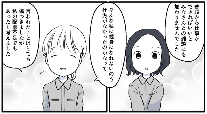 アンズさんも仕事さえできていればいいと考え、雑談にも加わらず、距離を置いてしまったことを反省していました。こうした態度では、周囲が親身になれなかったとしても仕方がないのではないかと感じていたようです。